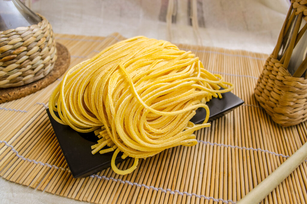 This is a traditional Italian meal that calls for spaghetti. I have never seen it served with any other pasta, like fettuccine or linguine. Make sure the pasta you use is of high quality, and verify the cooking time on the package. Make sure the pasta has a lot of starch. That’s what makes the sauce a lot thicker. My choice for this dish is Spaghetti alla Chitarra. Made from a wooden frame with strings stretched across, the chitarra resembles the strings of a guitar, giving the pasta its characteristic square edges as opposed to spaghetti’s long cylindrical shape.